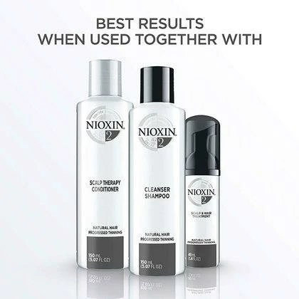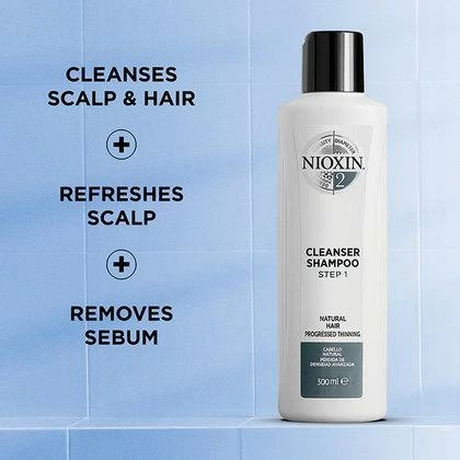 Prepare the scalp and hair for a complete hair thickening treatment with Nioxin’s 3-part System 2 Cleanser for Natural Hair with Progressed Thinning. This professional hair product’s Activ-Renewal technology helps remove sebum, fatty acids and other environmental residue from the scalp and hair. Nioxin’s derma-purifying shampoo deeply cleanses the scalp and provides thicker, fuller-looking hair. Nioxin’s cleanser is the first step of a 3-part Nioxin regimen, designed to strengthen the hair and amplify hair structure.