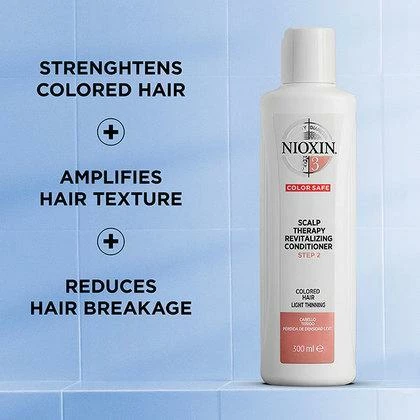 Strengthen and moisturize hair with Nioxin’s 3-part System 3 Scalp Therapy Conditioner for Colored Hair with Light Thinning. This density-protecting professional hair care product with BioAmp technology helps retain moisture balance, providing hair resilience. Lightweight, Nioxin conditioner is specially designed for colored hair with light thinning and leaves it thicker, fuller-looking. Nioxin’s Scalp Therapy Conditioner is the second step of a 3-part Nioxin regimen, designed to strengthen the hair and amplify hair structure.Â