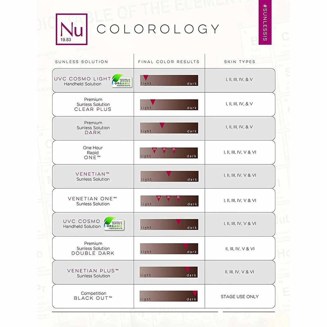 - VENETIAN SUNLESS SOLUTION: In less time than you can fly to the European Riviera, and minus the jet lag, you can get the same deep, rich colour that you crave. An exotic sunless formula with a unique combination of violet and brown tone bronzers, designed to mimic skin colours found on the beautiful beaches of the European Riviera. This first of its kind, deliberate and innovative formulation blends with all skin tones to produce a deep, long lasting tan.